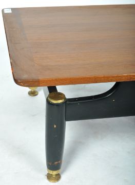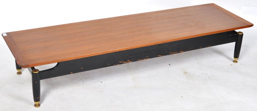 G Plan -  large retro vintage mid 20th Century tola / teak wood top librenza pattern coffee table, the suspension teak top raised on an ebonised frame and legs with E Gomme stamp to the base. Measures approx: 30cm x 168cm x 48cm.