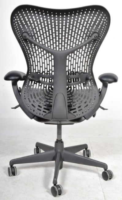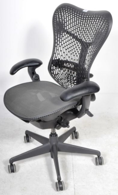 Studio 7.5 - Herman Miller - Mirra 2 - A late 20th Century retro swivel desk chair with adjustable positioning for posture. The armchair raised on a five point star base and castors. Mould marks for Herman Miller to the back with all finished in black and grey. Measures approx; 102cm x 73cm.