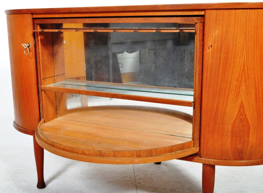 Sola Møbelfabrik - A retro vintage mid 20th Century Norwegian teak wood corner bookcase / cocktail drinks cabinet having a revolving central section with book shelves to one side and the other a mirrored back drinks section with fittings. Raised on tapering supports. Measures approx; 77cm x 113cm x 66cm.