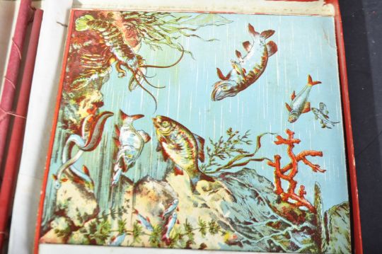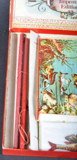 A late 19th Century German J. W. S & Sons of Bavaria made magnetic fishing game. A fishing pond board with fish and x2 red fishing rods. Housed within original box.