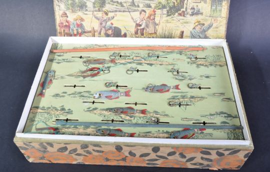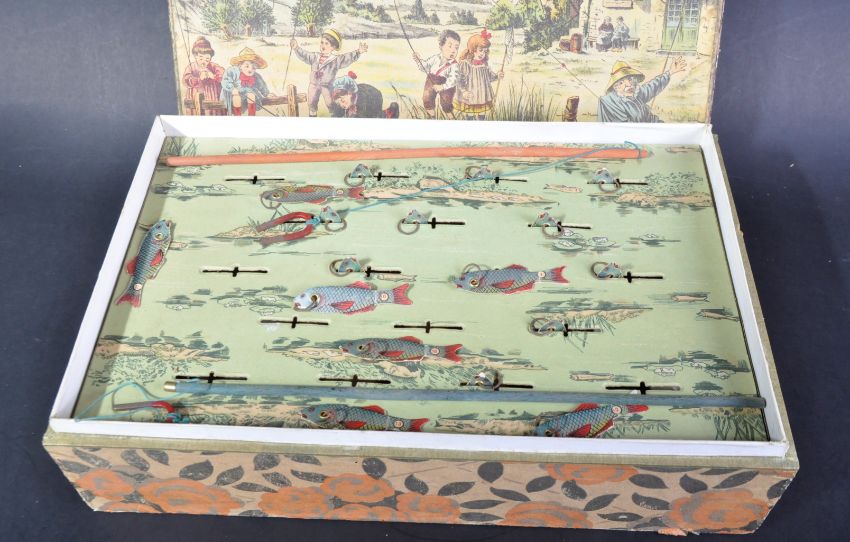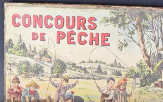 A late 19th Century French made magnetic fishing game ' Concours De Peche '. The raised inside tray with slots for the fish and x2 wooden rods with magnetic ends for catching. Housed within the original box.