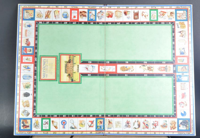 A vintage circa 1938 Waddingtons made ' Milestones The Game of Life ' board game. Illustrated board divided into 64 ' milestone ' squares with the player starting at birth and passes through the various phases of life, Babyhood, Schooldays, Varsity, etc. and after marriage ultimately retires at 64. Dice rolling game. Housed within original box.