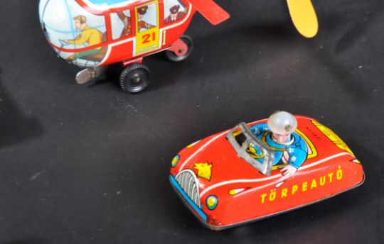 A collection of x4 vintage tinplate model vehicles comprising; Helicopter, Pullman Coach, Tank and Race Car.