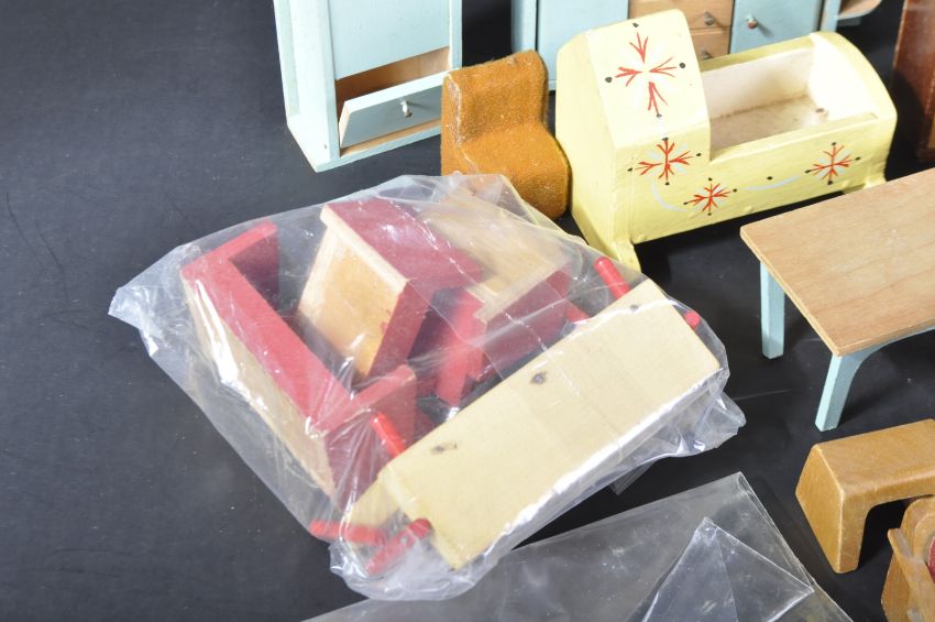 A large collection of vintage dolls house furniture of wooden construction. Examples to include; tables, chairs, fireplace, rocking chair, kitchen furniture and more.