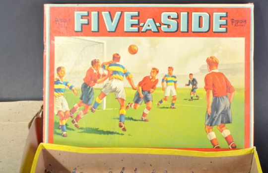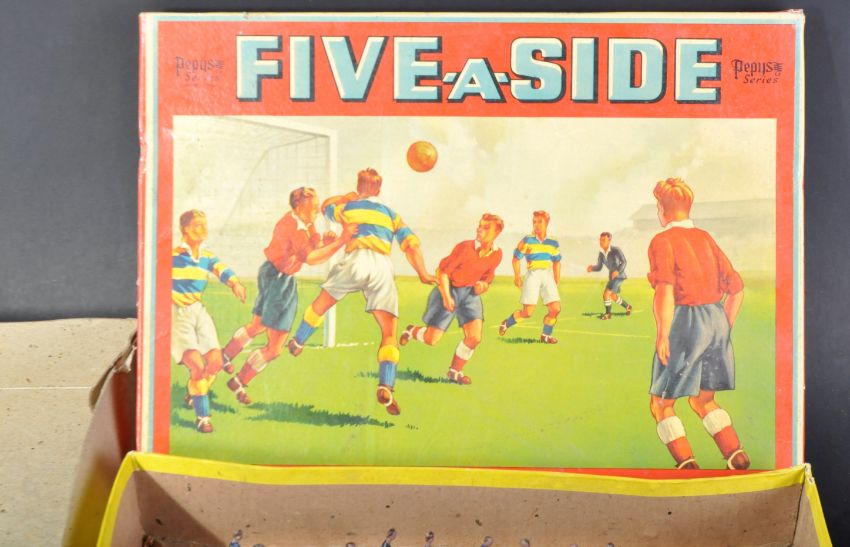 A vintage Pepys Series ' Five  A Side ' football board game with blue and red team players made from lead and a cardboard pitch. The board is made up of 13 squares the length of the pitch, and 7 squares wide. Housed in the original box.