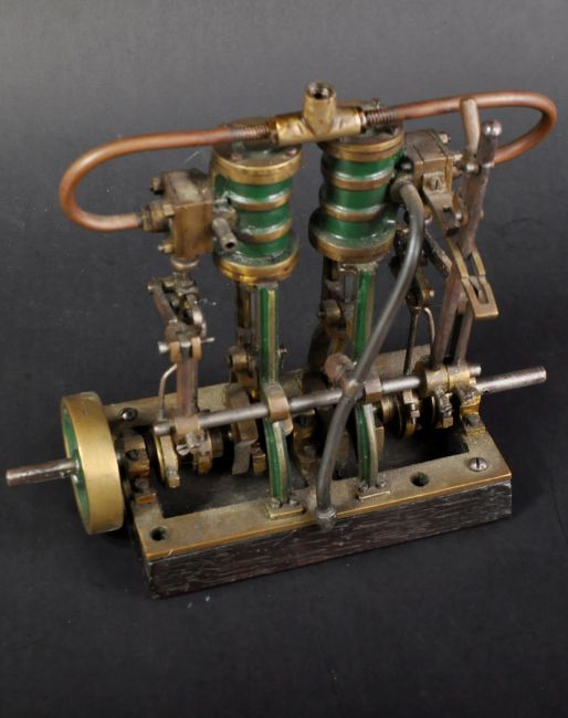 A vintage British Stuart Turner twin cylinder live steam model. Wooden box bed with brass plate, fly wheel and two twin breen cyclinders.