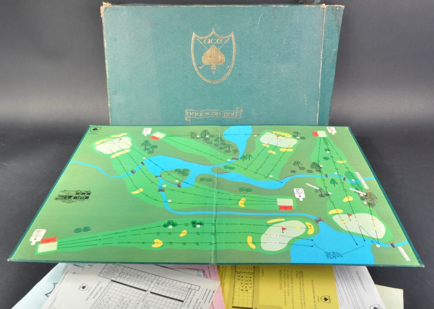 A vintage 1970's EMS Home Products Ltd ' Ace Handicap Golf ' board game. The large double sided boards depicting 18 golf holes with each hole containing various golf hazards. Dice rolling game.