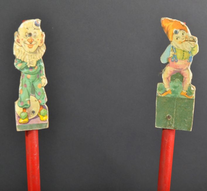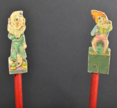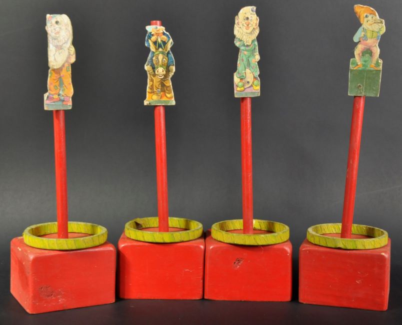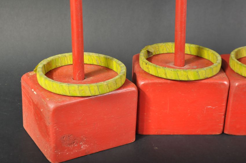 A set of x4 Victorian wooden throwing hoops and figures. The wooden stands with cardboard figures depicting circus clowns and yellow wooden hoops for tossing.