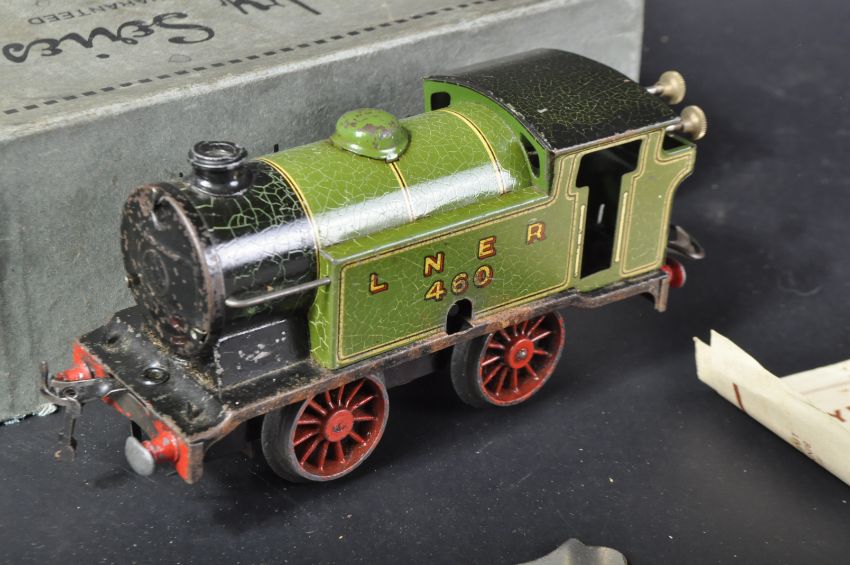 An original vintage Hornby made O gauge tinplate / clockwork model railway trainset locomotive. The LNER M3 tank loco with key and original box.