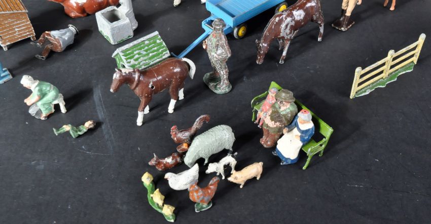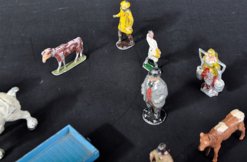 A collection of assorted vintage lead toy farm animals and farming equipment to include cows, sheep, pigs, a Dinky Toys trailer and others.