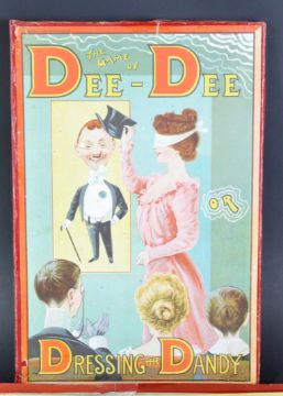 A 19th Century Victorian ' Dee Dee Dressing Dandy ' game. A blindfold style game with card board hat and bow tie for pinning to the cardboard face. Housed within original box.