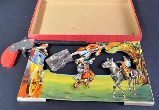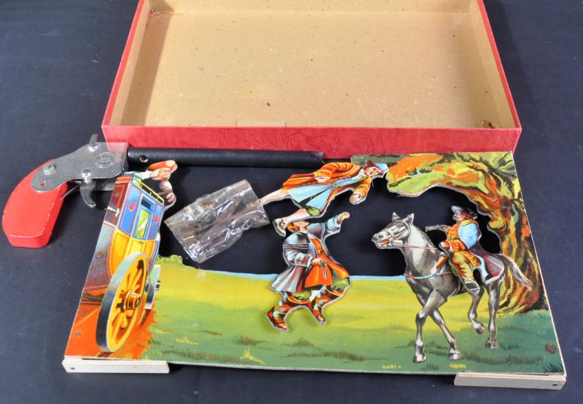 A vintage Chad Valley ' The Dover Road ' shooting game with cut out solid cardboard horse riding figures and a ' Bandit Repeater ' wooden gun. Housed within original box.
