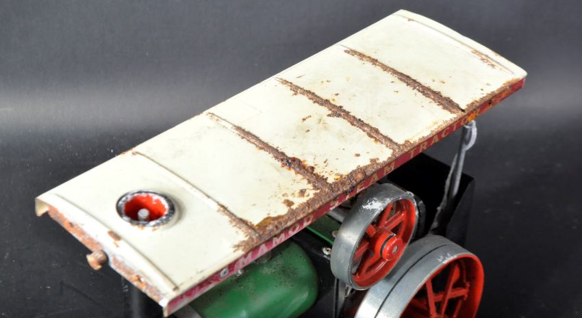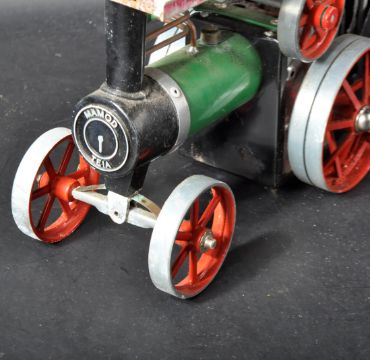 An original vintage Mamod live steam model Steam Tractor TE1A Traction Engine. A green and red model of liquid fuel example.