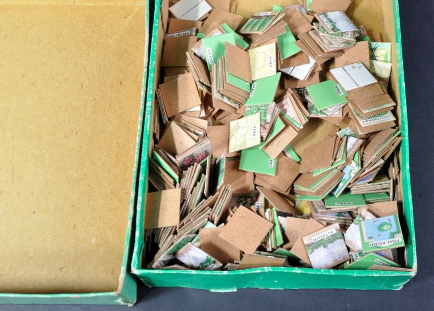 An early 20th Century circa 1920's ' Plantit Garden Lovers Game '. The board game depicting 4 gardens during winter, each garden is divided in to squares with botanical names and a centerpiece of 2 squares. Card cut out square tiles are similarly named and show summer bloom and garden furnishings. Containing within the original box.