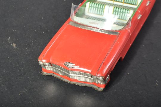 An original vintage Japanese Bandai made tinplate Cadillac convertible car. Red body work with green interiors and original plastic windscreen present.