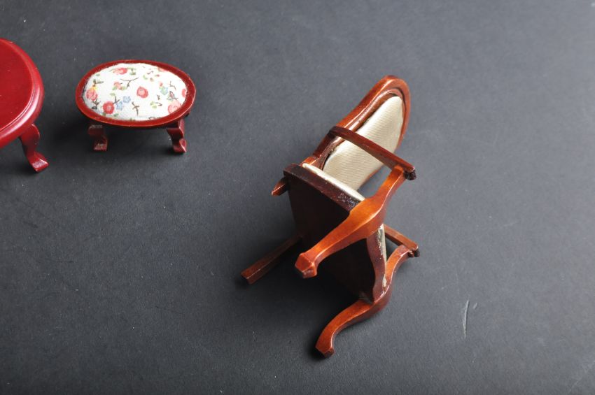 A large collection of vintage dolls house furniture of wooden construction. Examples to include; tables, chairs, wardrobes, bedroom items and other smaller decorative elements.