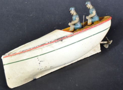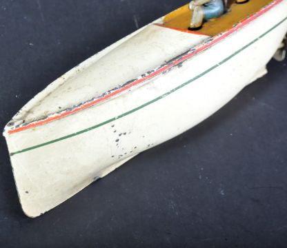 An early 20th Century circa 1910 tinplate clockwork model boat. White exterior with x2 passenger figures and rudder / propeller to the rear.