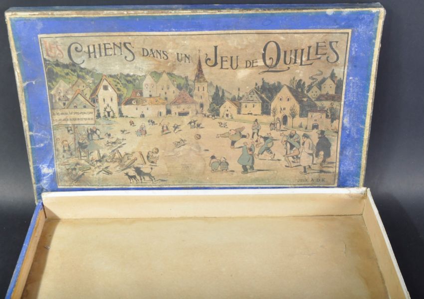 An early 20th Century French ice skating / dog bowling themed board game ' Chiens Dans Un Jeu Quilles ' with foldable board, cast metal dog figures and other playing elements. Housed within original box.