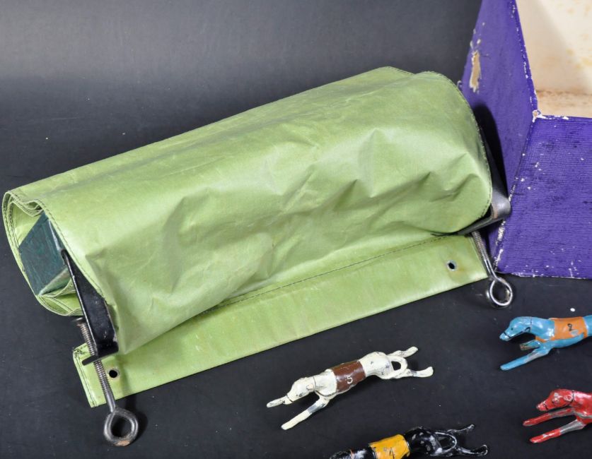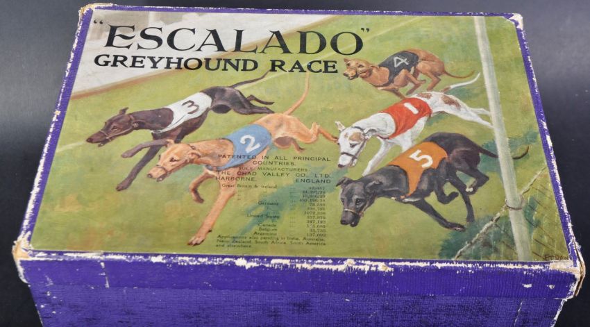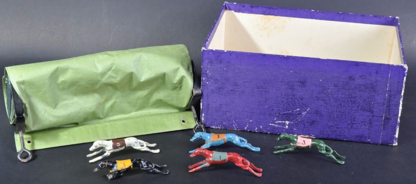 An early 20th Century / Pre-War Chad Valley made Escalado Greyhound Racing game with x5 cast metal greyhounds, rolled fabric track and original box.
