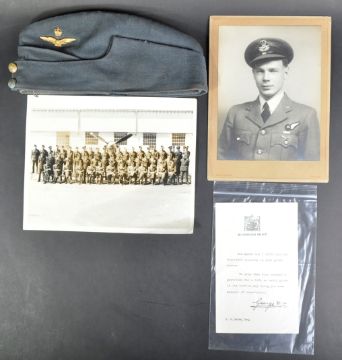 WWII Second World War - effects of one P/O J. W. Smith of the RAF Royal Air Force, killed in action 1943, comprising his original RAF side / forage cap with cap badge, a photograph of King by Hills & Saunders of Cambridge, a squadron photograph from the period, the letter from Buckingham Palace sent to his family (named to bottom), and tickets to Buckingham Palace for an Investiture (presumed to be when he was awarded his DFC medal). Poignant collection.
