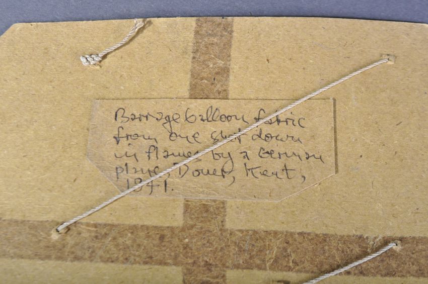 A small canvas section of original WWII Second World War British Barrage Balloon. Mounted on a piece of card, with notation to reverse ' Barrage balloon fabric from one shot down in flames by a German plane, Kent, 1941 '. The card measuring approx; 15cm x 20cm.