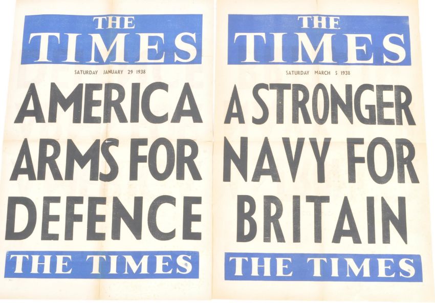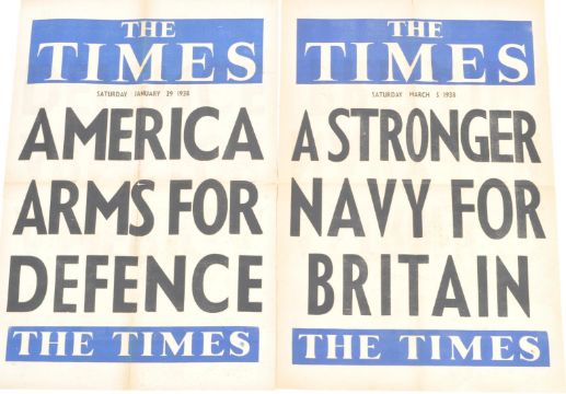 WWII Second World War - a pair of original pre-WW2 The Times newspaper stand headline posters. The first dated March 5th 1938 ' A Stronger Navy For Britain ' and the second dated January 29th 1938 ' America Arms For Defence '. Folded. Measures approx; 38cm x 51cm
