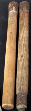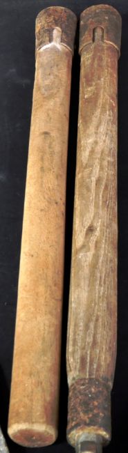 Two WWII Second World War British Army entrenching tools - one dated 1944 with maker's marks for Elwell, and stamped with broad arrow. Both with wooden handles.
