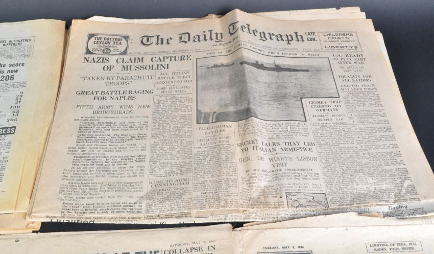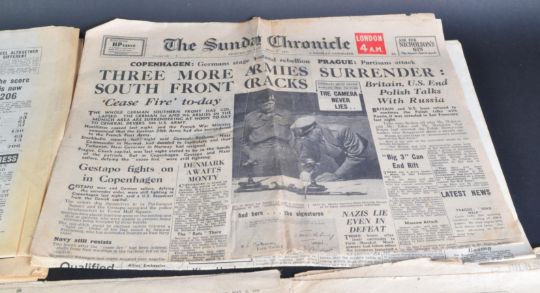 A collection of WWII Second World War related newspapers. Includes headlines: Three More Armies Surrender, Cease Fire Was At 8 (May 1945), Germany Offers Surrender, Big Hun Losses In 9hr Dieppe Battle, Britains First Day Of War and others. Most appear complete papers.