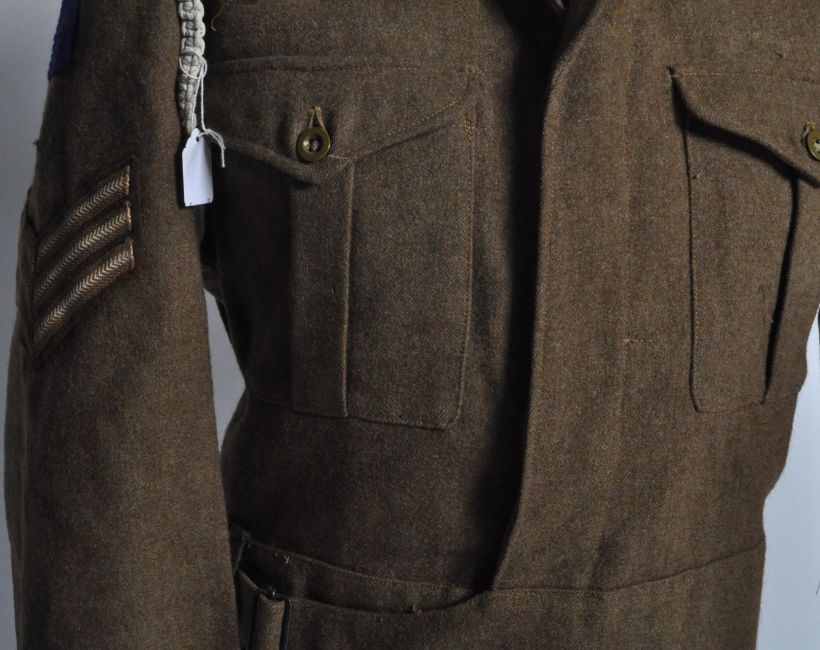 An original post-WWII Second World War 1949 Pattern soldier's Battledress Blouse with insignia for a Sergeant in the Royal Artillery. With cloth patches to arms and white lanyard to epaulette. Original label to interior.