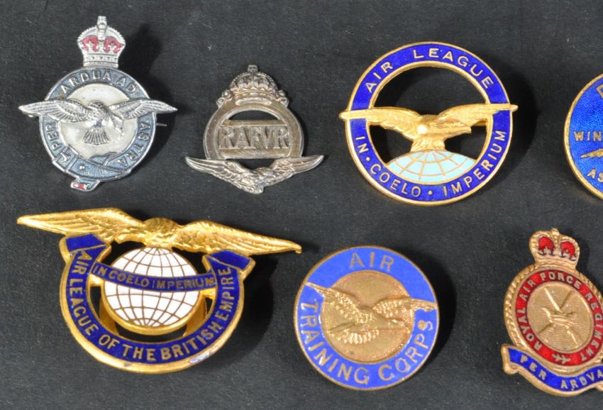 A collection of x7 original 20th Century WWII Second World War and later RAF Royal Air Force Volunteer Reserve, Air League, Winter Sports Association and others. All original. Many with maker's marks to the rear.