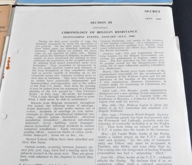 An original WWII Second World War ' Secret ' / Restricted ' Belgium Zone Handbook No.1 - East & West Flanders Part II Economic Survey ' document. Marked Secret to top, stamped for 1st Battalion, Irish Guards. Information correct as to October 15th 1943.