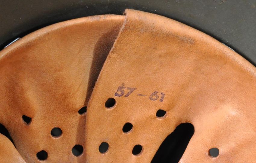 A scarce original post-WWII Second World War c1950s / 60s West German Bundeswehr stahlhelm steel helmet. Based on the WW2 Third Reich Nazi M40 pattern, the helmet features its original leather liner and chin strap. Maker's stamp on rear brim, and sizing information to liner. Chin strap buckles welded to side (scarce variation). Very few of these helmets were made. Generally in excellent original condition.