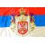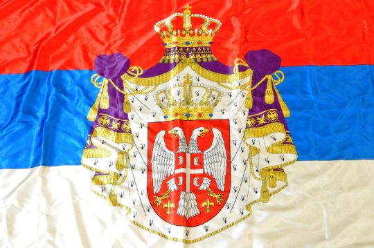 WWI First World War Interest - a large replica 20th Century silk / satin flag of Sebian / Serbian flag. Well made, with central crest on white, blue and red ground. Ideal for re-enactment. High quality. Measures approx; 86cm x 153cm.