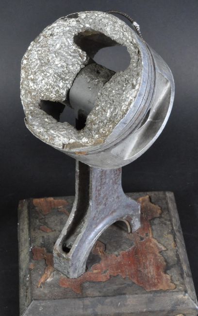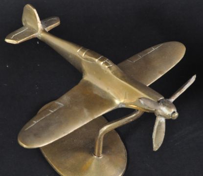 A collection of WWII Second World War interest RAF Royal Air Force related items to include; desktop brass model of a twin-engined aeroplane, a relic engine piston, brass model of a Spitfire on base, photograph and other items. Assorted collection.