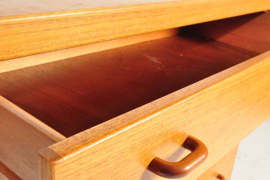 A retro 20th century Turnidge of London teak wood pedestal chest of drawers. Raised on an inset plinth having an upright bank of drawers, all with loop wooden teak handles. Makers label verso on back panel. 96cm x 91cm x 48cm.