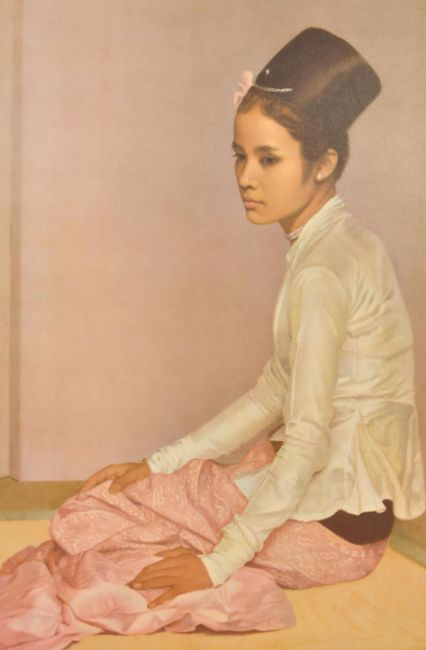 Sir Gerald Kelly- A circa 1960's print of 'The Burmese Princess Saw Hon Nyun', set on a pink velvet background frame with gilt edges. Label to verso. Measures 76cm tall by 64cm wide.