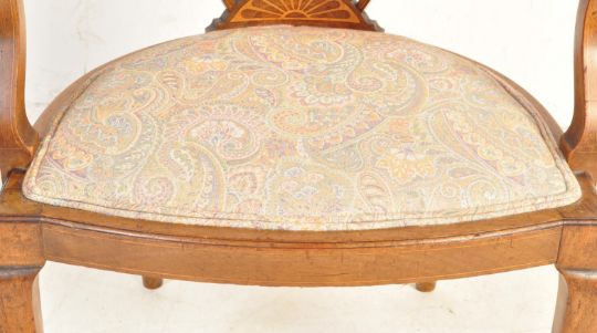 An Edwardian mahogany and line inlaid salon armchair. The chair being raised on cabriole legs with pad feet supporting a paisley upholstered pad seat with arched back rail and fan shaped spindle gallery. Line inlaid elbow rests on s-scroll supports. Measures approx: 72cm x 54cm x 49cm.