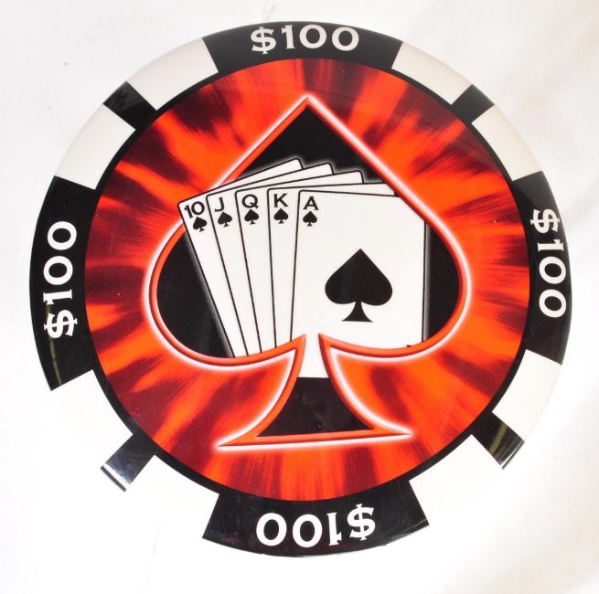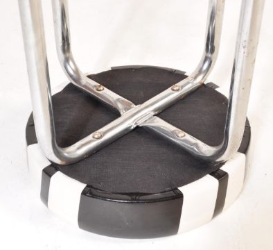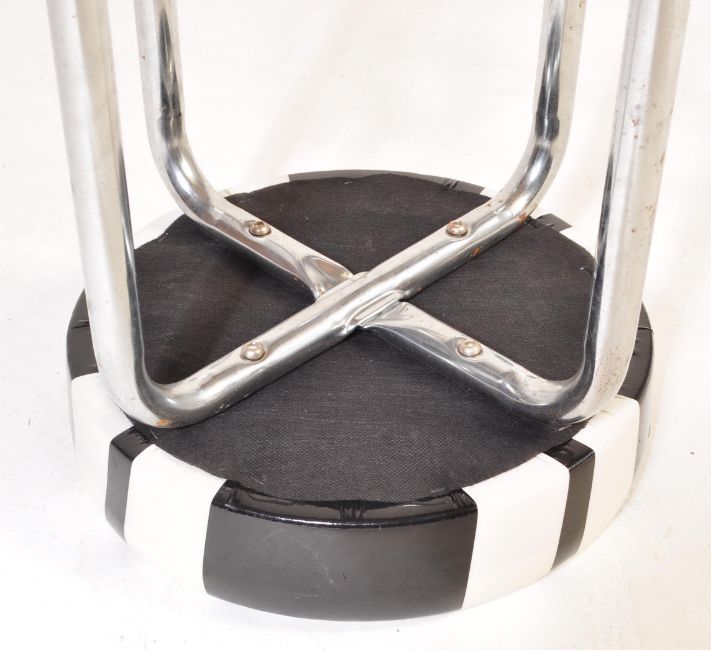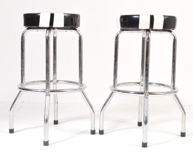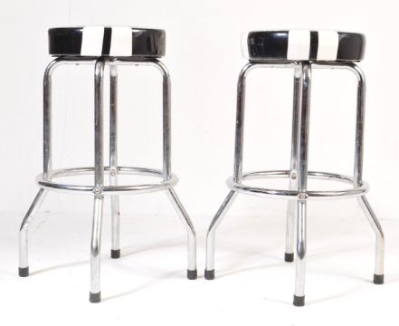 A matching pair of late 20th Century bar stools with both having circular padded tops with casino style poker chip tops raised on four chrome supports united by a circular footrest stretcher. Each measures approx; 72cm x 55cm diameter.