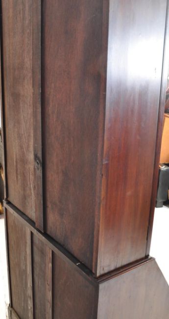 An Edwardian mahogany bureau bookcase. Raised on squared legs with a chest of drawers having fall front bureau atop. Appointed interior within. Finished with a twin door bookcase cabinet atop. Flared top pediment above. Measures approx: 206cm x 75cm x 44cm.