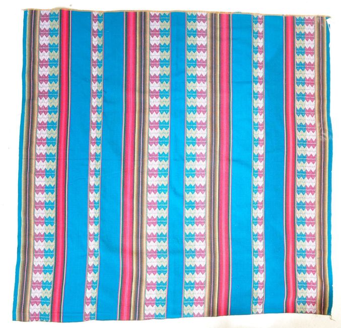 A contemporary Peruvian / South American tribal rug having polychrome banding with geometric motifs throughout. Measures 120cm x 116cm.