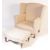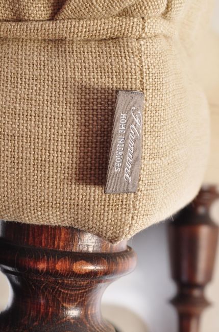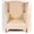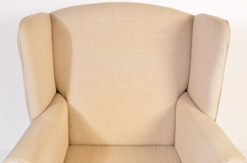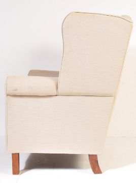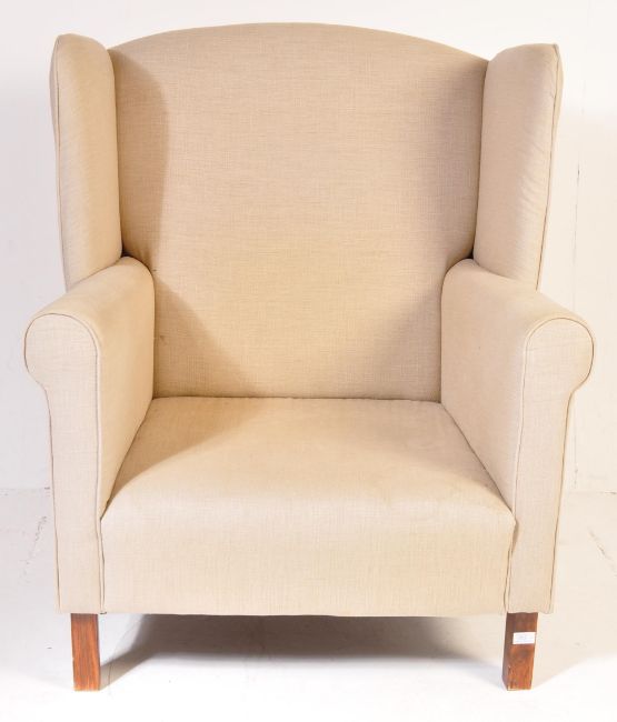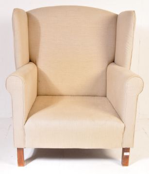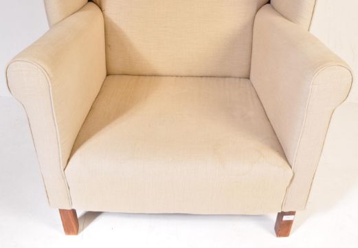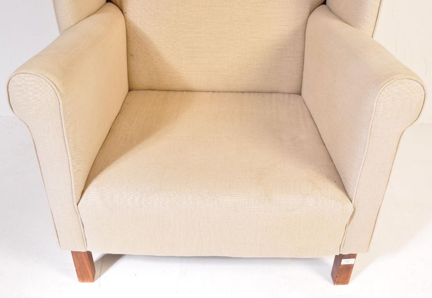 Flamant Home Interiors - A contemporary high end designer high wingback armchair / fireside arm chair and two matching footstool rests. The chair having a beige fabric upholstery with scrolled arm rests raised on straight leg supports. The two shaped footrests fitting into on another raised on turned supports. Labels present. Armchair measures approx; 116cm x 90cm x 74cm.