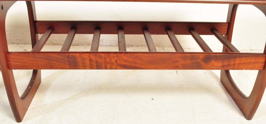 A mid century retro teak wood long john rectangular coffee table with slatted underside together with another similar teak wood long john coffee table and a nest of tables. Measures approx; 47cm x 90cm x 48cm.