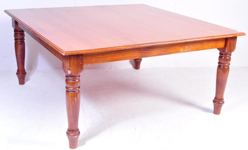 A large Victorian style mahogany library table. Raised on turned legs rising to a fitted frieze frame and being finished with a large square mahogany table top with chamfered edge detail. Measures approx: 77cm x 160cm x 160cm.