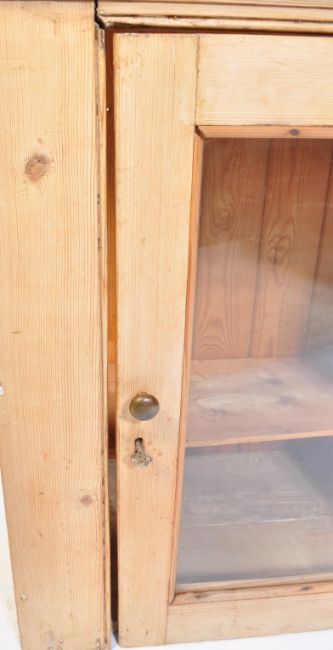 A Victorian 19th century country pine glazed hanging display cabinet. The pine body with central door having unglazed centre with storage within. Glazed panel sides, plain top above. Measures approx: 69cm x 69cm x 38cm.