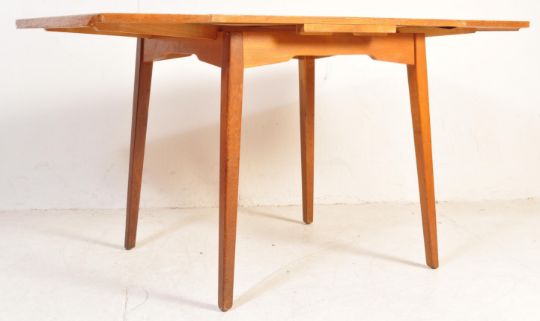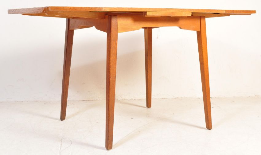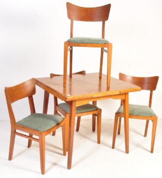 E. Gomme - G Plan - Brandon Range - A retro vintage mid 20th Century golden oak draw leaf table and matching four chairs. The table of square form with lipped extending leaves raised and supported tapering supports. The four chairs having panel backs with pad seat pads and straight leg supports united by stretchers. Measures approx: 76cm x 84cm 76cm.