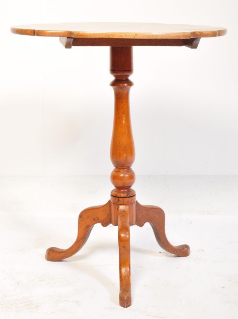 A 19th century Victorian mahogany tilt top pedestal wine table. The table being raised on splayed legs with turned column having and armorial shaped tilt top table above. Measures approx: 69cm x 58cm x 44cm