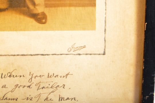 'Best Wishes Mrs Sams' - A framed and glazed photograph of gentleman holding his coat with a pipe in his mouth a cane in his hand. Notation below reading 'When You Want A Good Tailor Sams Is The Man'. Signed by Janus Skillton. As a gift for his wife. Photo measures approx; 250mm x 180mm. Leather back frame measures approx; 37cm x 27cm.