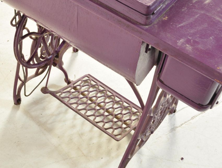 A  Victorian 19th century upcycled painted purple singer sewing machine base table. The wrought iron treadle base being of decorative form having an oak painted upcycled top above. Measures approx: 78cm x 87cm x 41cm.