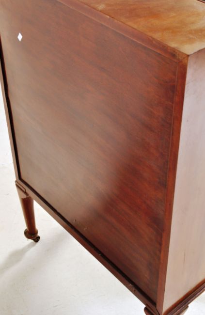 A 1940's Queen Anne revival mahogany bureau desk. The bureau with cabriole legs and pad feet supporting a central bank of drawers with fall front bureau atop. Within, a fully appointed interior. The drawers with brass handles. Ivorine plaque for PE Gane of Bristol. Measures approx: 108cm x 70cm x 41cm.