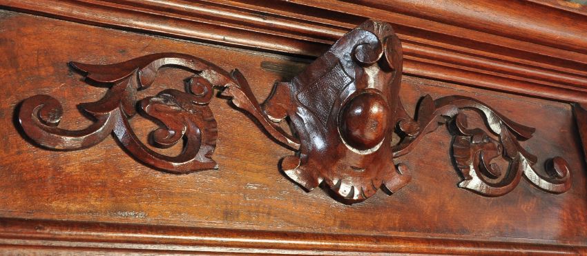 A 19th century French walnut buffet de corps - twin section sideboard - bookcase cabinet. Raised on bun feet with flared plinth having large double door cupboard. Above, a further double door cupboard with shelved interior. Finished with a flared edge cornice atop.  The doors being profusely carved in relief with Flemish design. Measures approx: 201cm x 107cm x 56cm.